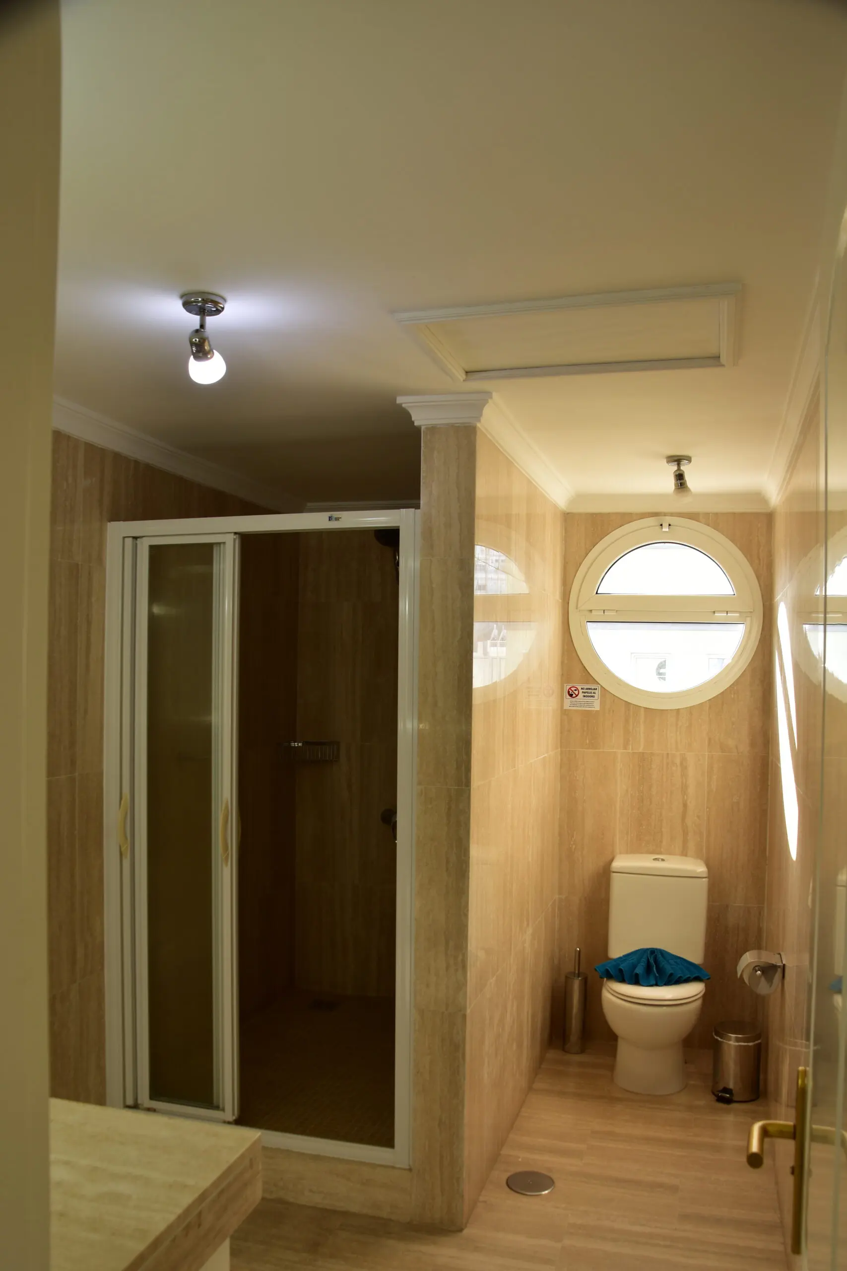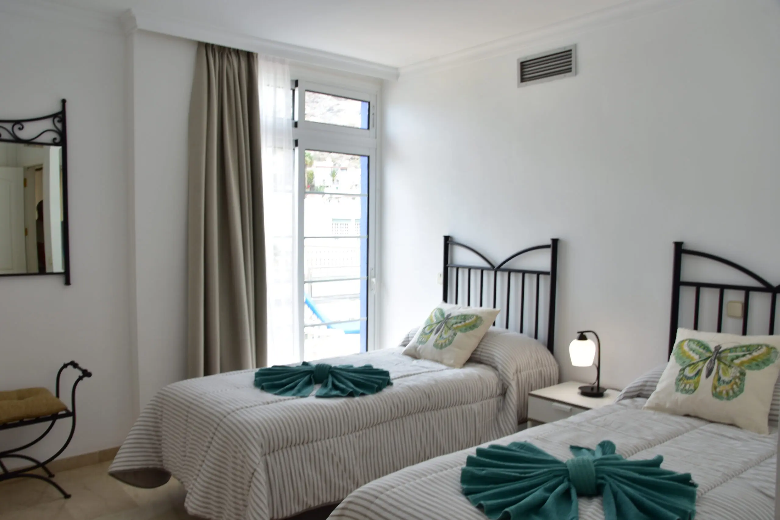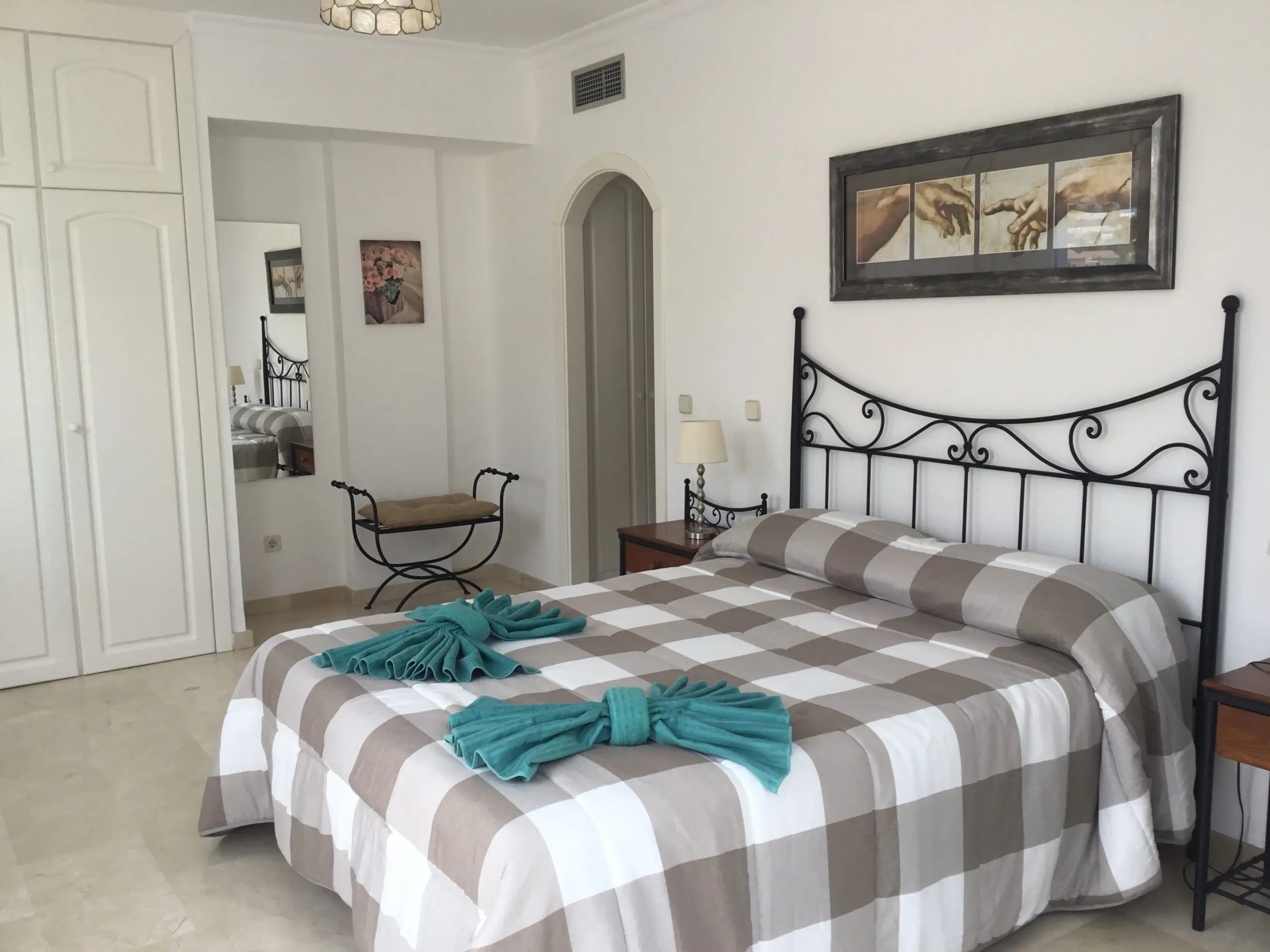It has 2 bedrooms: the master bedroom with a double bed and a private bathroom with a shower, and a second bedroom with two single beds. Both have large wardrobes for added convenience.